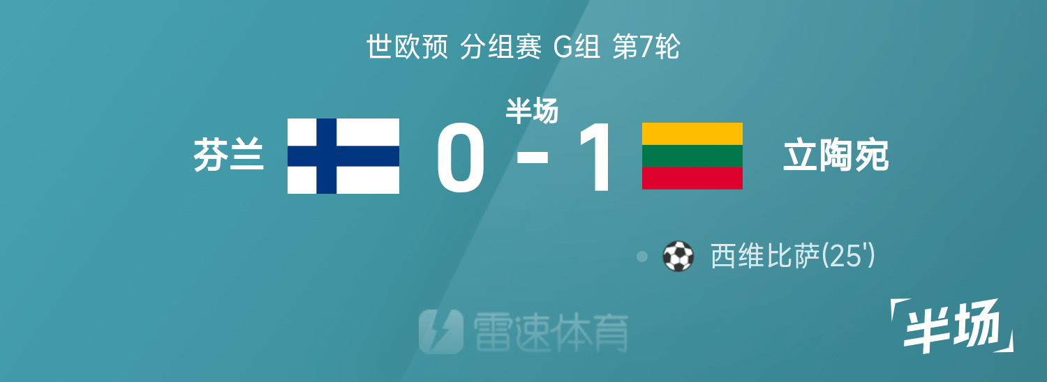10月10日讯 26赛季世欧预分组赛G组第7轮,芬兰迎战立陶宛。半场战罢,双方比分暂为芬兰0-1立陶宛,西维比萨破门建功。
